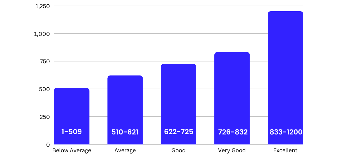 Using a variety of scoring methods, the credit reference companies condense the details in your credit record to a score between 1-1,200. A credit score is measured from below average to excellent. A score between 1-509 is below average, 510-621 is average, 622-725 is good, 726-832 is very good and 833-1200 is excellent.