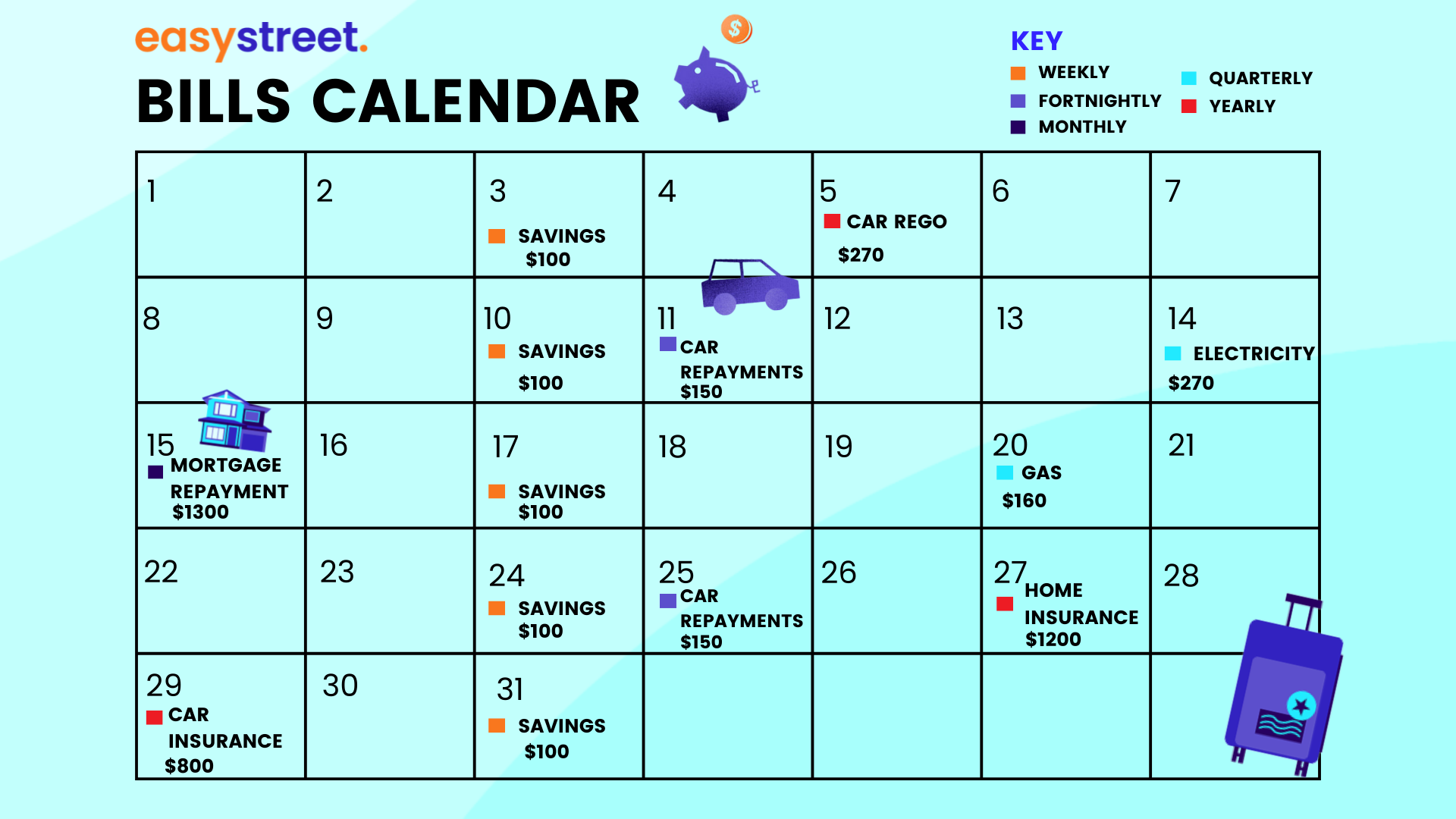 Having a budget is one thing. However, if you struggle with budgeting and feel stressed about whether you’ll have the money to cover the electricity bill or school fees, try using a monthly calendar to organise your expenses (see an example of an Easy Street Bills Calendar below).