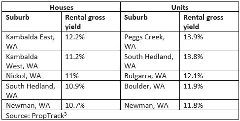 Topping yields for houses in regional locations is Kambalda East, located 630 kilometres east of Perth, where investors can earn gross rental yields of 12.2%.