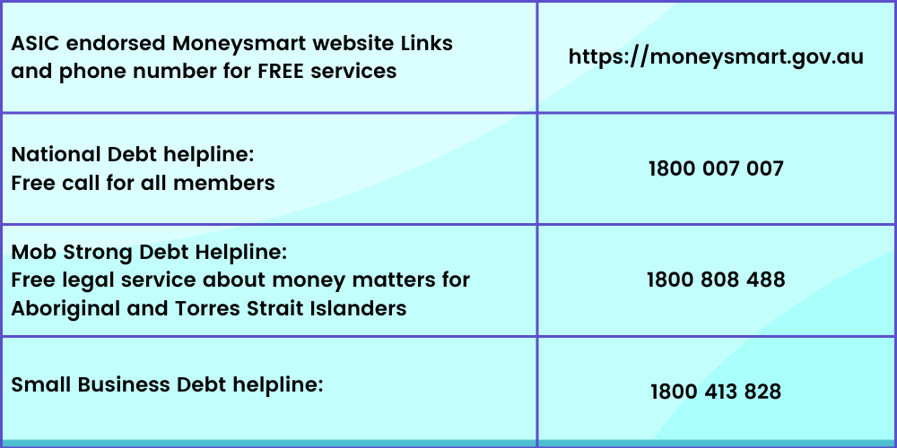 For more information on financial counsellors go to moneysmart.gov.au/managing-debt/financial-counselling.